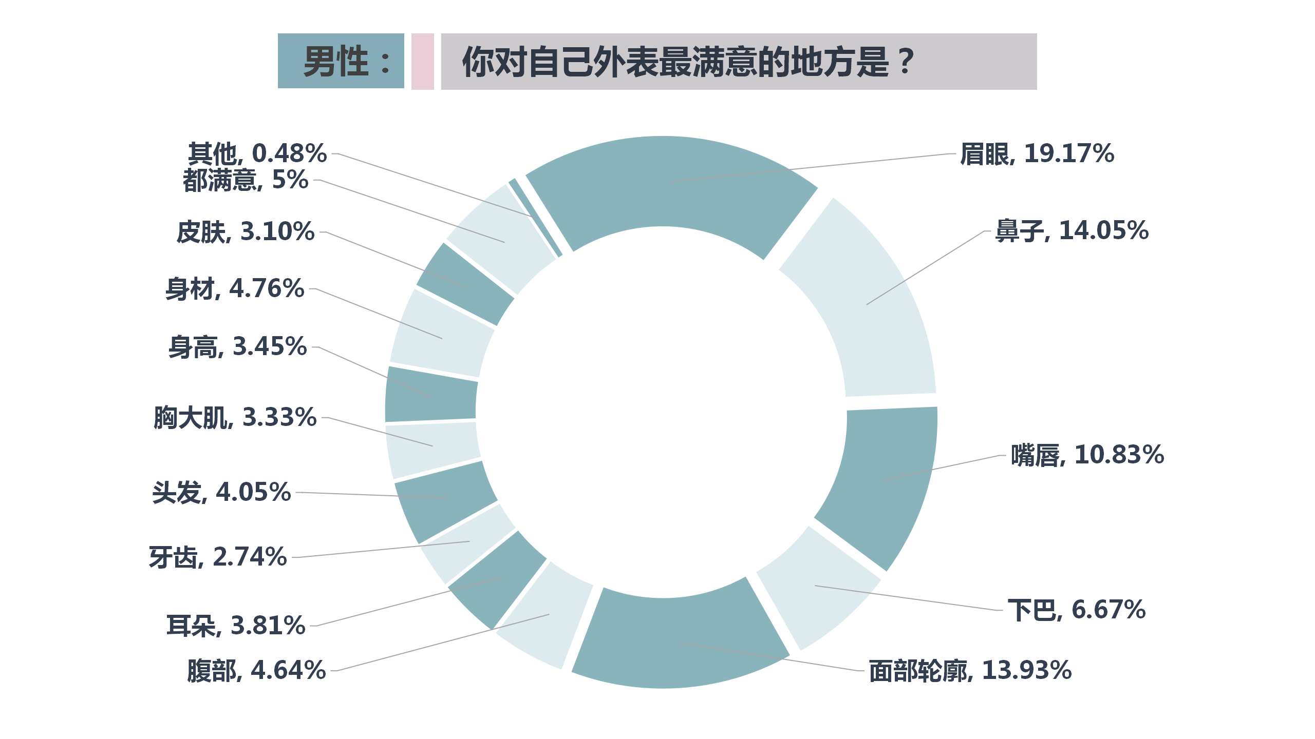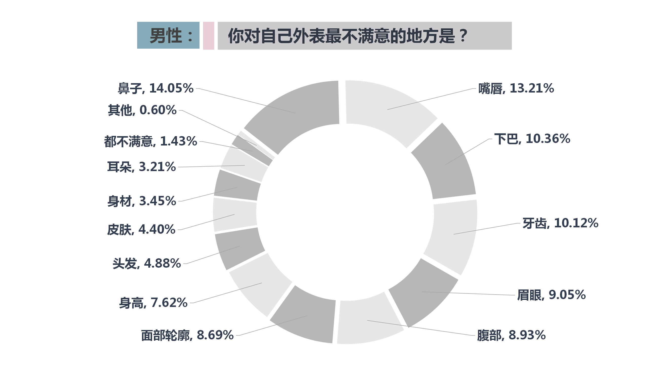 有53.92%的男性受訪者對(duì)自己的容貌身材感到滿(mǎn)意,男性受訪者對(duì)自己的眉眼滿(mǎn)意,選擇比例占19.17%,其次是鼻子(14.05%)、面部輪廓(13.93%)。但也有相當(dāng)一部分男性認(rèn)為自己外貌一般甚至不滿(mǎn)意,占46.07%。受訪男性不滿(mǎn)意的部位是鼻子(14.05%),嘴唇(13.21%)、下巴(10.36%)次之。