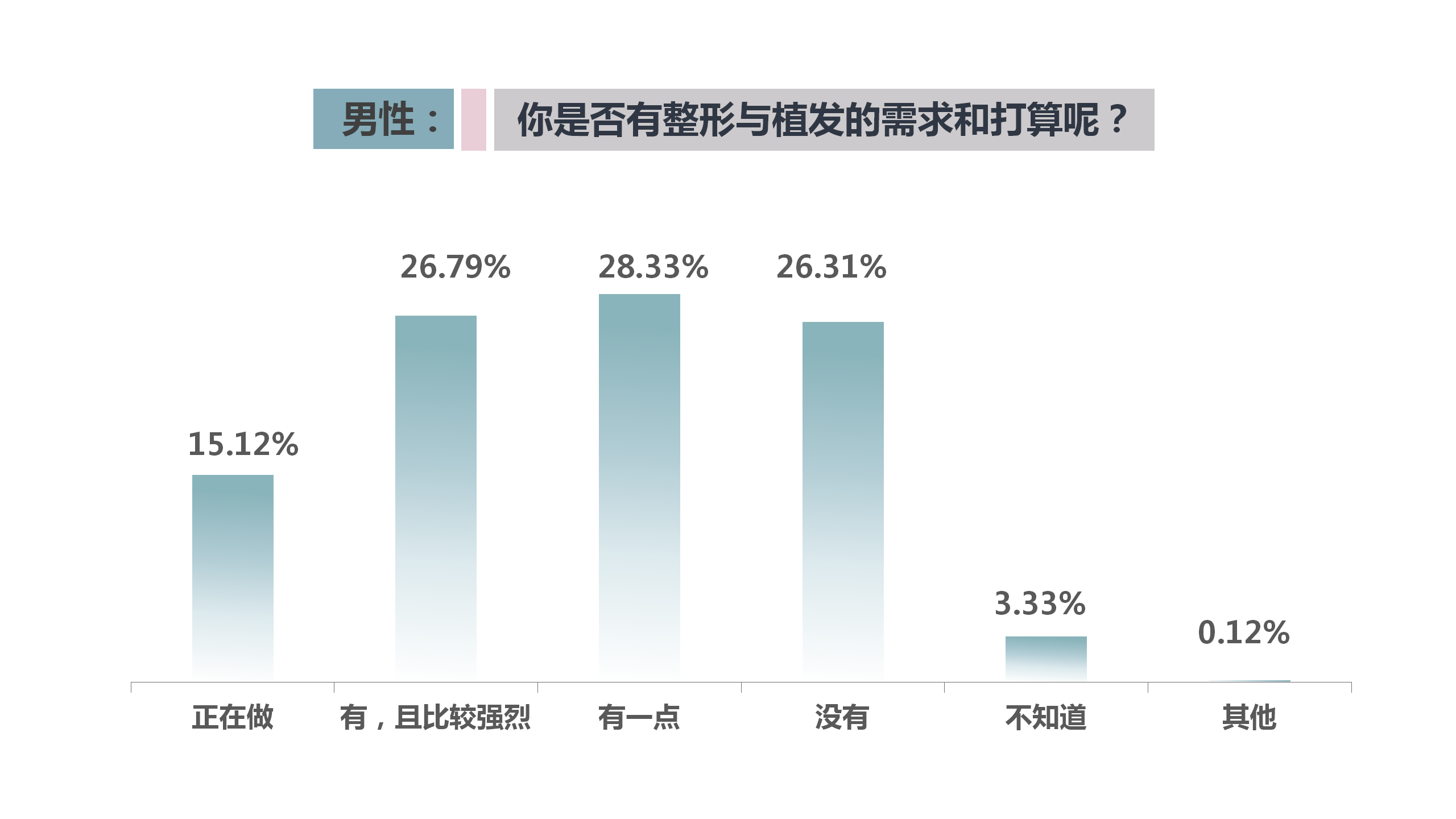 沒(méi)有男性會(huì)嫌棄自己太帥,只會(huì)覺(jué)得不夠帥,當(dāng)無(wú)法通過(guò)健身、護(hù)膚品獲得良好的外形時(shí),也會(huì)有不少男性通過(guò)醫(yī)美整形的手段去再塑自己的外貌。分析數(shù)據(jù)發(fā)現(xiàn),大部分男性并不抗拒整容整形,其中有28.33%的受訪者表示有一點(diǎn)想整,26.79%的受訪者則明確表示有強(qiáng)烈的需求,另有15.12%的受訪者透露正在做。當(dāng)問(wèn)及受訪者身邊是否有男性做過(guò)或正在做整容整形項(xiàng)目,明確表示有的人占66.31%。由此可見(jiàn),男性群體對(duì)整容整形有著較高的接受度和較為強(qiáng)烈的消費(fèi)需求,消費(fèi)發(fā)展?jié)摿薮蟆?/p>