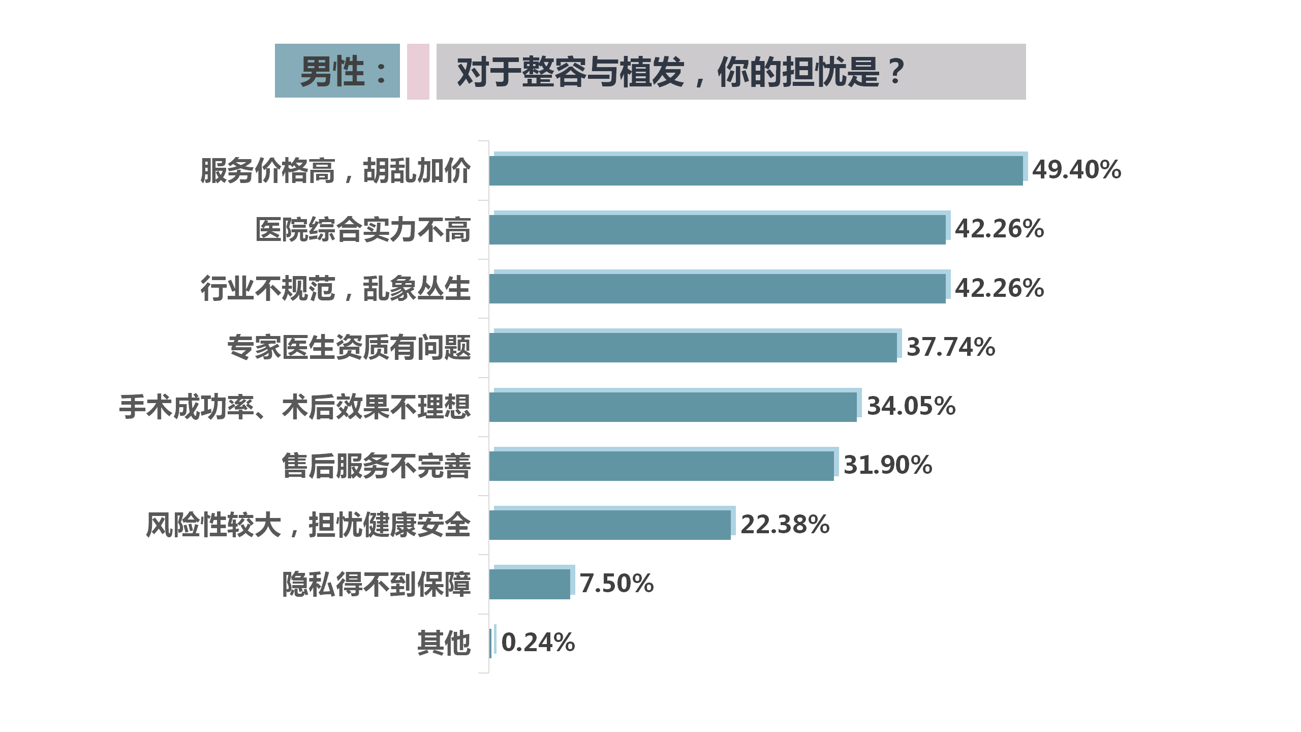 雖然男性受訪者表達(dá)了自己對(duì)整容整形的強(qiáng)烈需求,但同樣也對(duì)該行業(yè)的服務(wù)消費(fèi)有著多方面的擔(dān)憂(yōu)。行業(yè)服務(wù)價(jià)高、胡亂加價(jià)的現(xiàn)象常見(jiàn),稍有不慎,可能還會(huì)造成更大的經(jīng)濟(jì)損失,因此也成為49.40%的男性受訪者主要擔(dān)憂(yōu)的問(wèn)題;其次是行業(yè)不規(guī)范、醫(yī)院綜合實(shí)力不高問(wèn)題,受訪者選擇的比例均為42.46%;還有37.74%的人質(zhì)疑醫(yī)生的資質(zhì)和技術(shù)水平。