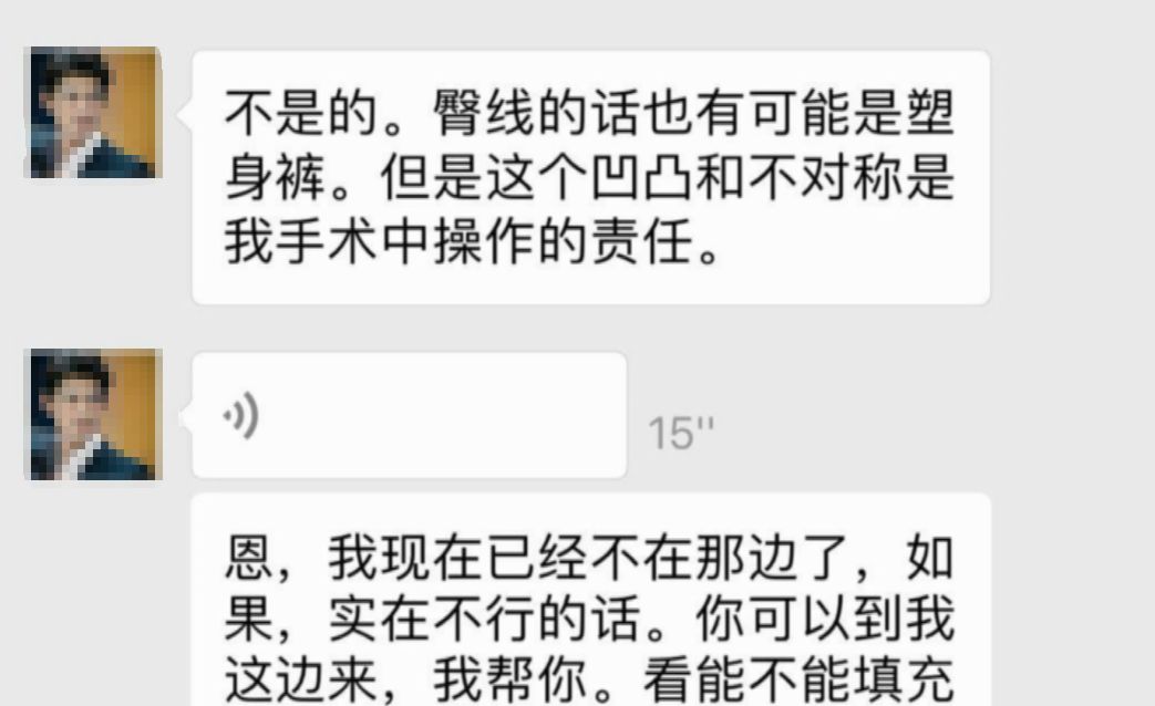 小譚聯(lián)系了當(dāng)時(shí)為她實(shí)施手術(shù)的任醫(yī)生,對(duì)方承認(rèn)"凸凹不平和不對(duì)稱是手術(shù)中操作的責(zé)任",不過(guò)自己已經(jīng)從美貝爾醫(yī)療美容辭職,建議小譚還是直接去找診所。