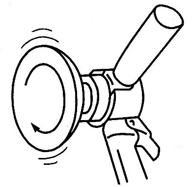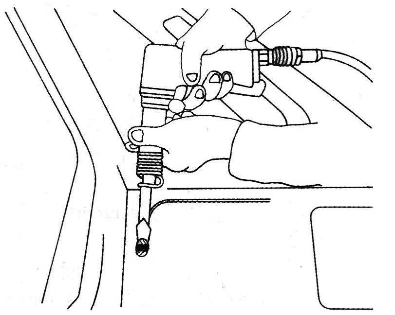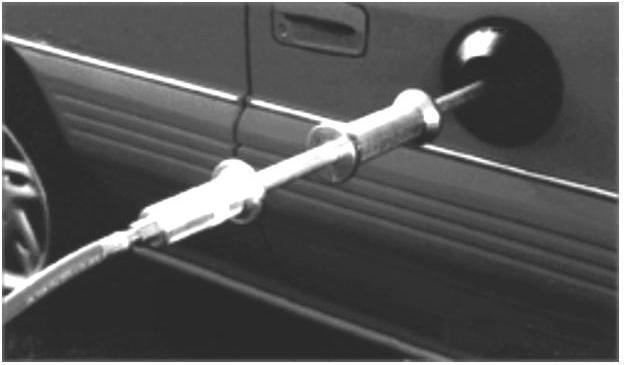 對于某些配備密封型車身面板的車型,無法利用現(xiàn)成的孔洞使用撬鎬撬起凹陷時,可以采用凹坑拉出器或拉桿將凹陷拉平。凹坑拉出器的頂端如圖13所示呈螺紋形,螺紋可以旋緊在孔中,然后利用套在桿中部的沖擊錘向外沖擊手柄端面,同時向外拉手柄,即可將凹點慢慢拉起。