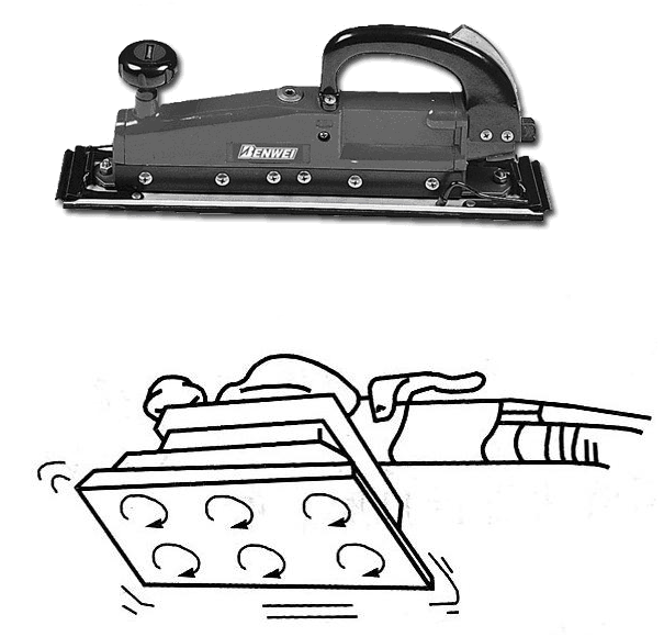 往復(fù)直線式打磨機如圖34所示,這種打磨機的砂墊做往復(fù)直線運動,主要用于車身上的特征線和凸起部位的打磨作業(yè)。