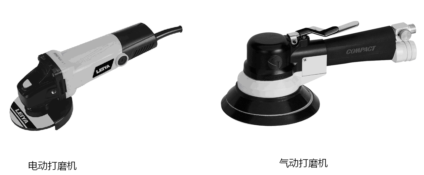打磨機根據(jù)驅(qū)動方式分為電動打磨機和氣動打磨機,如圖30所示。打磨機使用時可以靈活選裝不同規(guī)格的研磨片,進行打磨除銹和拋光等工作。在車輛噴漆車間執(zhí)行打磨作業(yè)時,由于車間的的汽車漆料屬于易燃品,因此為了防止意外,應(yīng)選用氣動打磨機執(zhí)行打磨作業(yè)。氣動打磨機種類很多,大致有單作用打磨機、軌道式打磨機、雙作用打磨機和往復(fù)直線式打磨機四種。