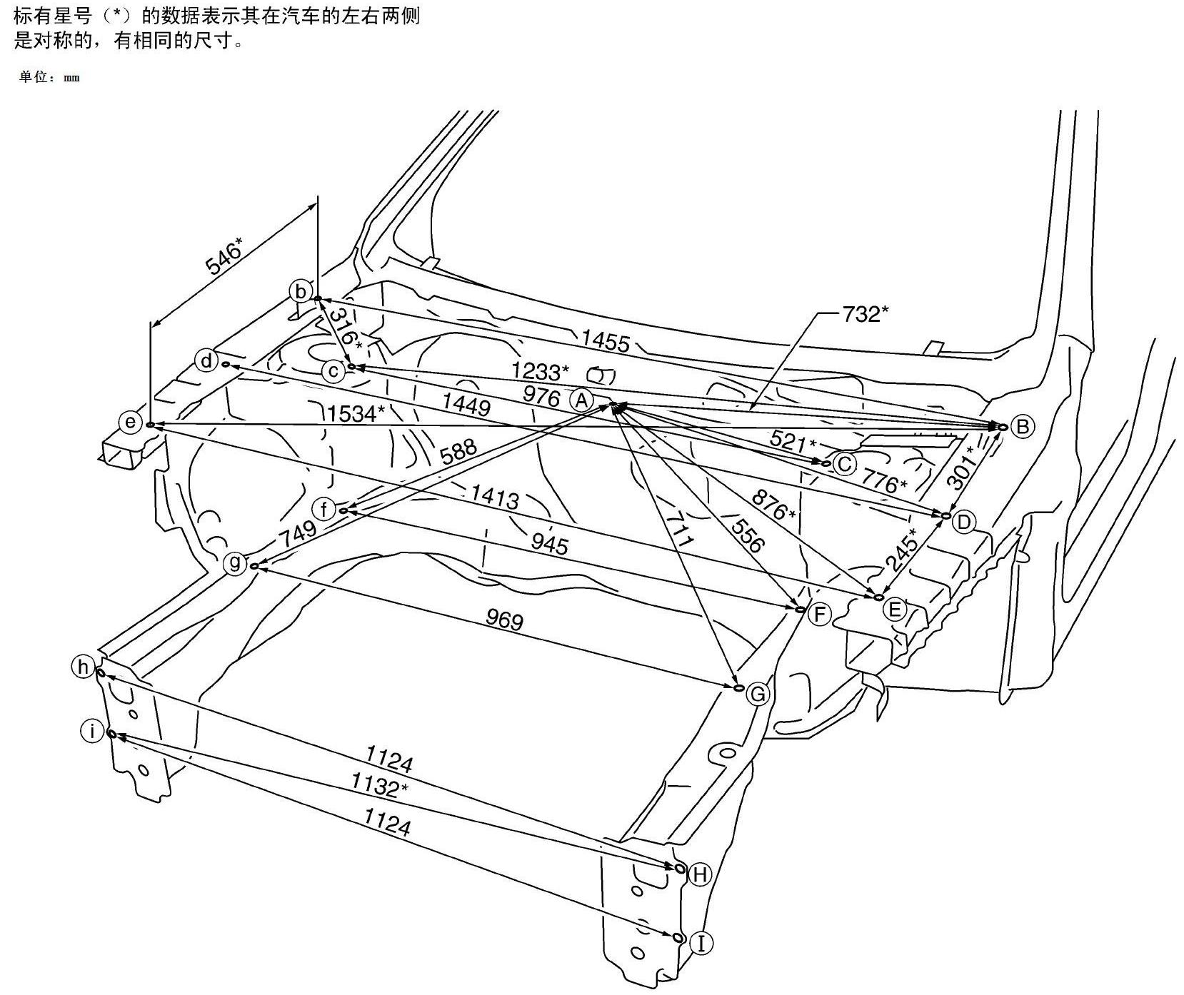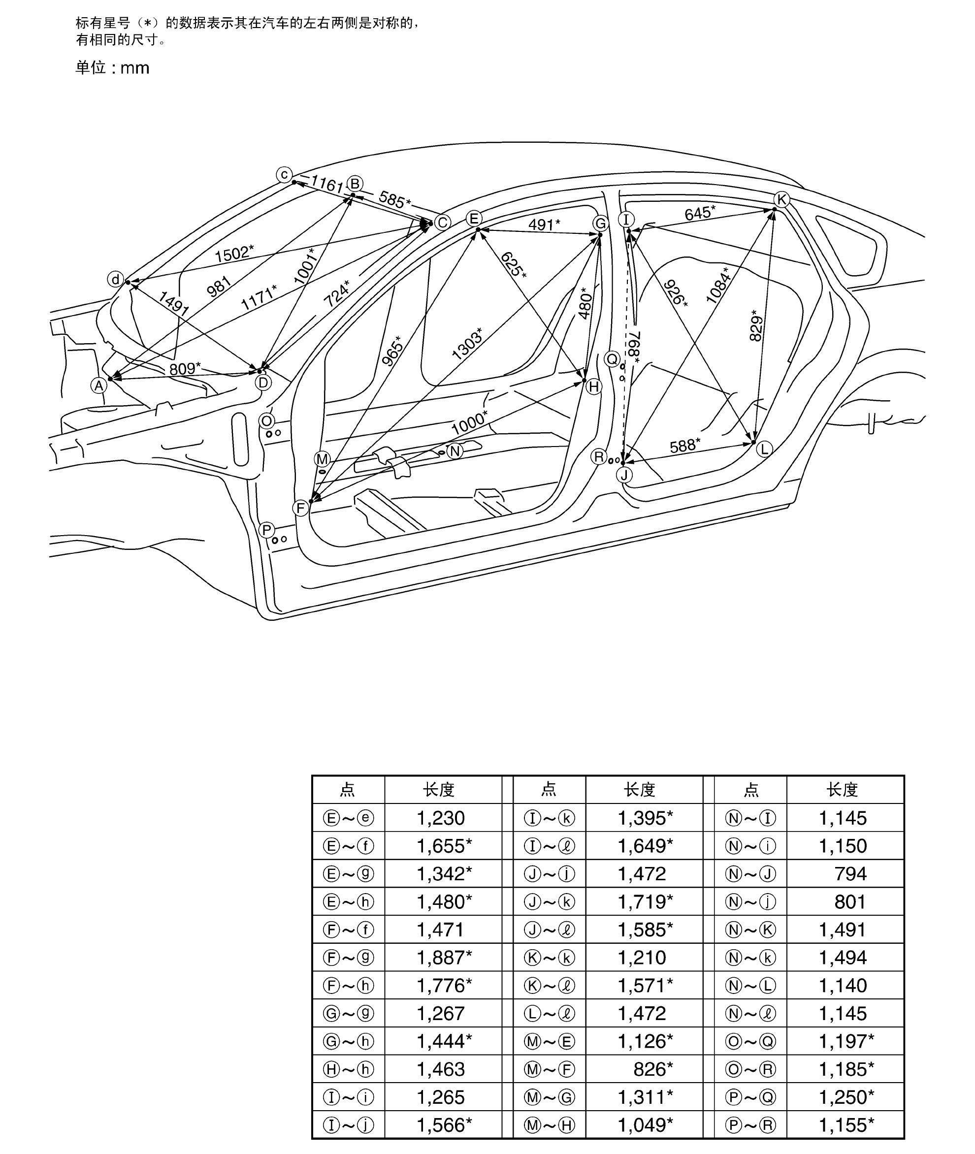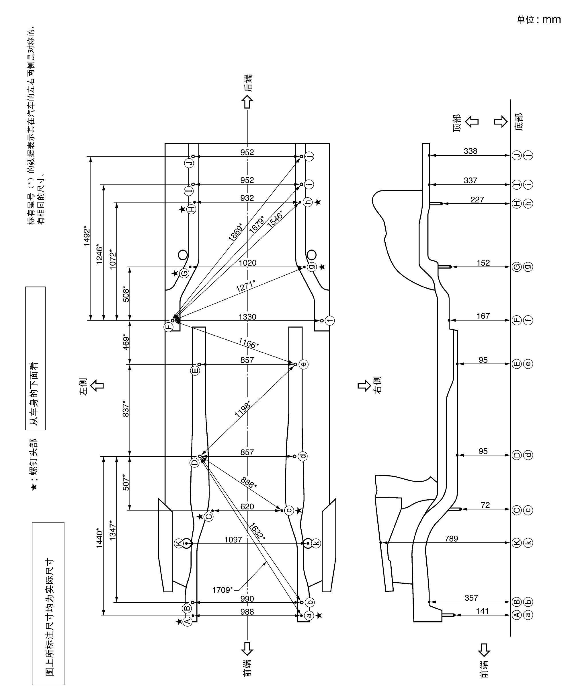 汽車碰撞后,如果是輕微的剮蹭或擦傷,只需用鈑金工具進行整形校正即可。但對于嚴(yán)重的碰撞導(dǎo)致車身變形的故障,就需要使用車身尺寸測量設(shè)備準(zhǔn)確測量車輛的變形程度,為制定進一步的整形維修方案進行準(zhǔn)備。汽車生產(chǎn)廠家在具體車型的維修手冊中均會給出車身尺寸的準(zhǔn)確數(shù)據(jù),以東風(fēng)日產(chǎn)車系天籟轎車為例,該車的車身標(biāo)準(zhǔn)尺寸可參見圖37~圖39所示,維修人員測量完車身尺寸后,可將測量值與這些標(biāo)準(zhǔn)數(shù)據(jù)進行對比,從而判定汽車受碰撞后的變形程度,然后使用大梁矯正機等整形設(shè)備對變形的車身進行校正修復(fù)工作。因此維修工在工作實踐中,要注意收集各個車型的車身尺寸標(biāo)準(zhǔn)數(shù)據(jù),檢測評估車身損傷時,可以這些尺寸為基準(zhǔn),判定損傷程度;修復(fù)、校正也以這些尺寸為依據(jù);竣工檢驗還是以這些數(shù)據(jù)為檢驗標(biāo)準(zhǔn)。