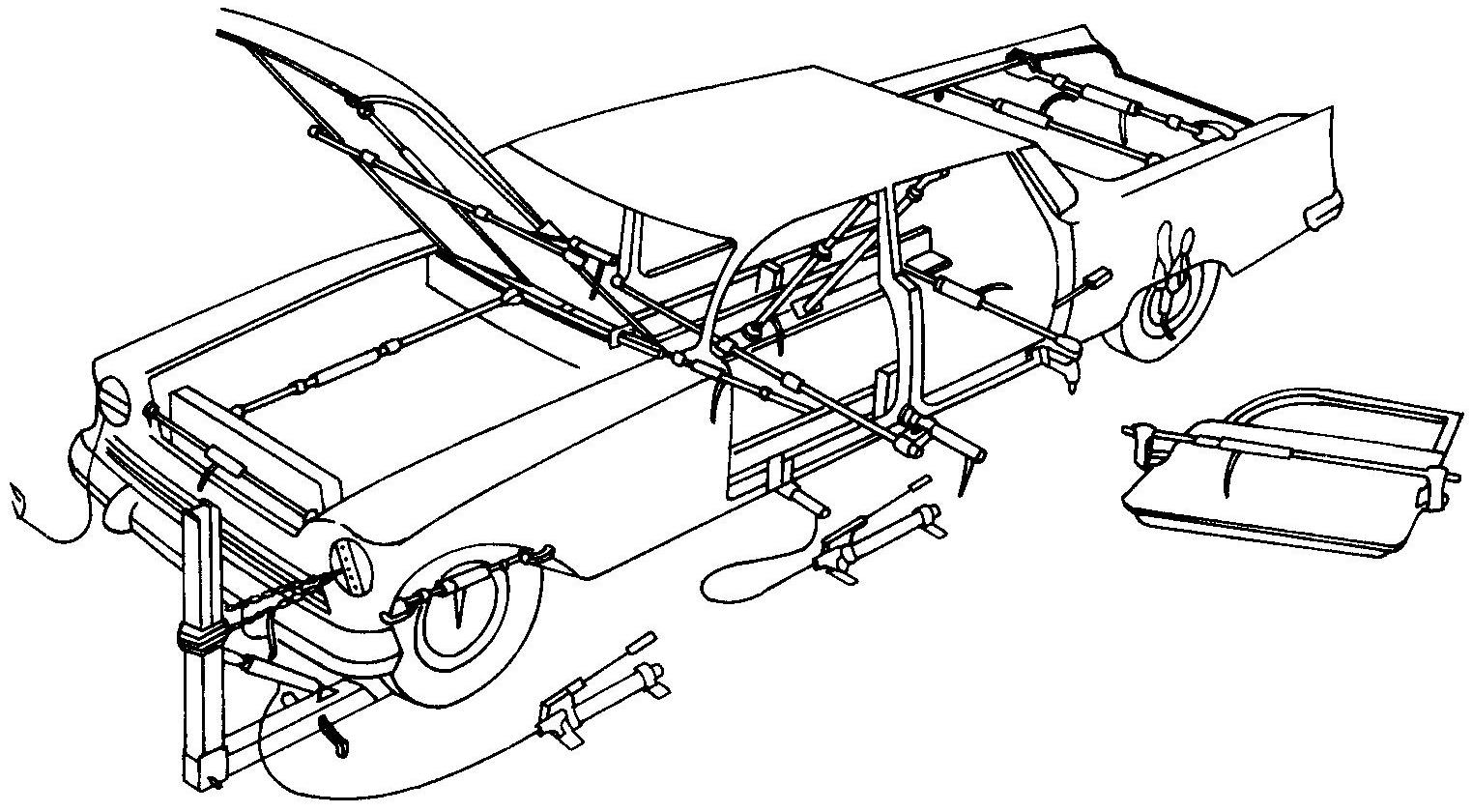 輕便液壓桿系統(tǒng)如圖47所示,利用手動液壓泵提供液壓力,液壓缸活塞桿運動,在液壓桿兩端裝上適當(dāng)?shù)亩祟^,就可方便、省力地對損傷車身部位進行推壓、展寬、夾緊、拉拔和延伸,達到校正的目的。液壓桿系統(tǒng)與其他校正設(shè)備結(jié)合,能從多方面、多角度完成車身各部分的校正操作,如圖48所示。