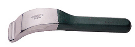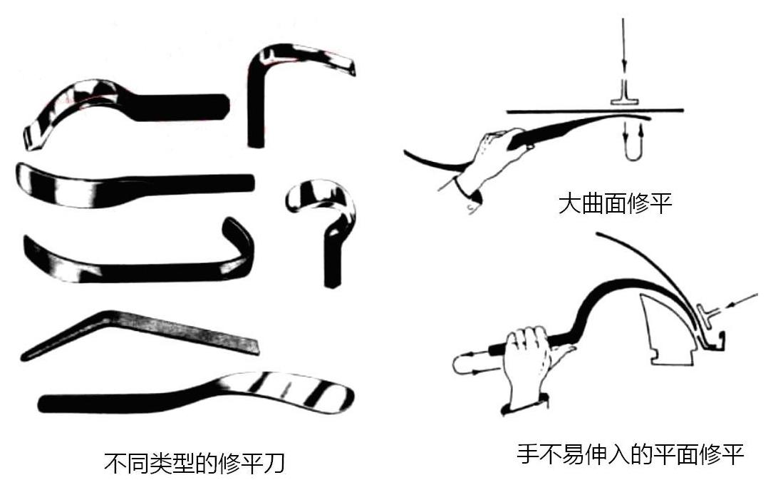 修平刀如圖9所示。修平刀是車身修理的特殊工具,使用時將修平刀緊緊貼在待修表面,然后再捶打修平刀,對修復(fù)某些微小隆起或使劃傷部位恢復(fù)原狀有效,參見圖10。修平刀種類很多,如圖11所示。對于某些襯鐵無法放入操作的弧形凹陷位置,也可以使用修平刀充當(dāng)襯鐵使用。