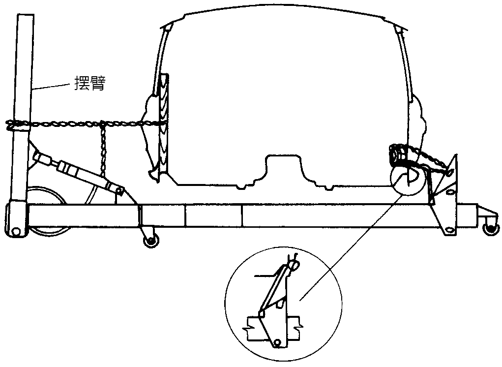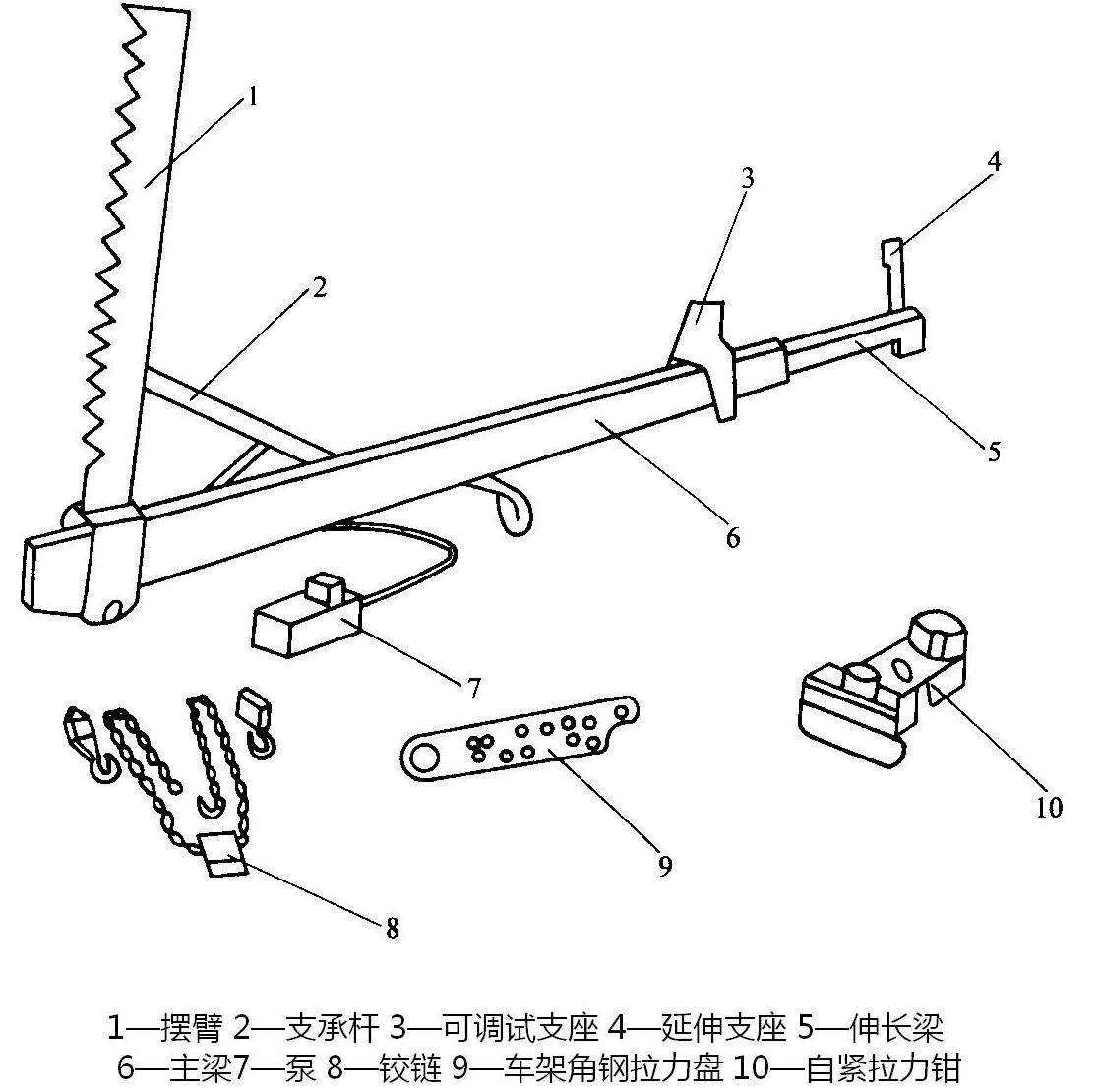 簡易便攜式車身牽拉器如圖45所示,能在任意方向施加校正力。校正時,主梁、支座和橫梁常用于把汽車抬離地面,它們和下車身夾組合使用時,形成基座。使用時可參照圖46所示,將擺臂用鏈條及拉力鉤與需校正的部分連接,用液壓泵與支承桿使擺臂運動,把變形部位拉復(fù)位。