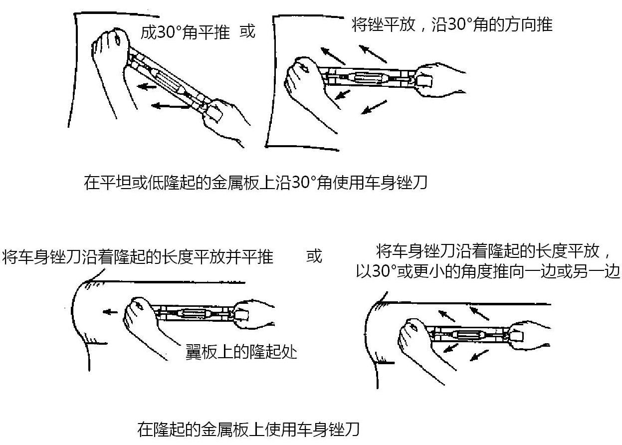 車身銼刀是在汽車鈑金維修中用來修整由于使用錘子、襯鐵、或使用修平刀等鈑金工具造成的凹凸不平的加工痕跡的工具,如圖21所示。使用車身銼刀可以將加工痕跡銼平。以便進行噴漆等修補。車身銼刀的使用方法參見圖22。