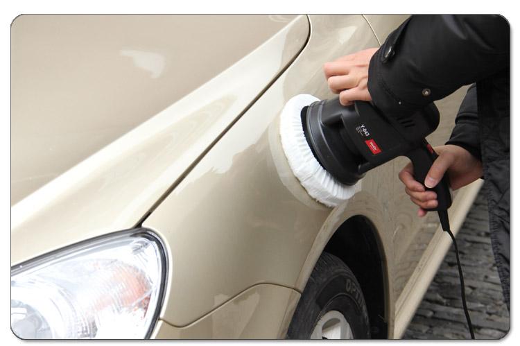汽車車身的表面經(jīng)過噴涂后,可能會出現(xiàn)粗粒、砂紙痕、流痕、反白、橘皮等漆膜表面的細(xì)小缺陷,處理方法就是在噴涂后使用汽車表面拋光機進行研磨拋光處理,以提高漆膜的鏡面效果,達到光亮、平滑、艷麗的要求。典型的汽車表面拋光機如圖35所示。拋光機由底座、拋光盤、拋光織物、拋光罩及蓋等基本元件組成。電動機固定在底座上,固定拋光盤用的錐套通過螺釘與電動機軸相連。拋光織物通過套圈緊固在拋光盤上,電動機通過底座上的開關(guān)接通電源起動后,便可進行拋光,參見圖36。常見的汽車表面拋光機普遍帶有轉(zhuǎn)速調(diào)節(jié)功能,可以在操作時根據(jù)具體情況靈活調(diào)節(jié)拋光盤轉(zhuǎn)速,使之達到好的拋光效果。