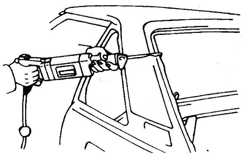氣動鋸如圖25所示,主要用來在汽車鈑金操作中切割車身板材構(gòu)件時使用,參見圖26。氣動鋸比手工鋸工作效率高,而且不象手工鋸受到鋸弓的限制導(dǎo)致有些部位無法切割,氣動鋸鋸條只有一端裝在鋸身上執(zhí)行切割作業(yè),切割縫可以無限延長,因此氣動鋸具有切割效率高、使用方便,對構(gòu)件損壞程度小的優(yōu)點。
