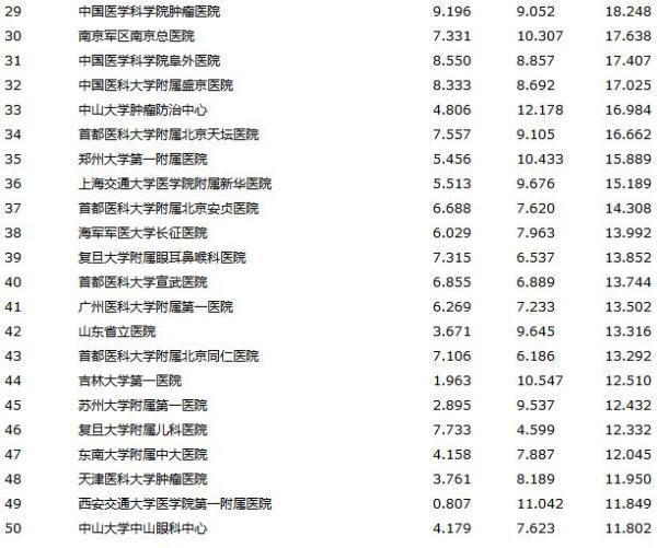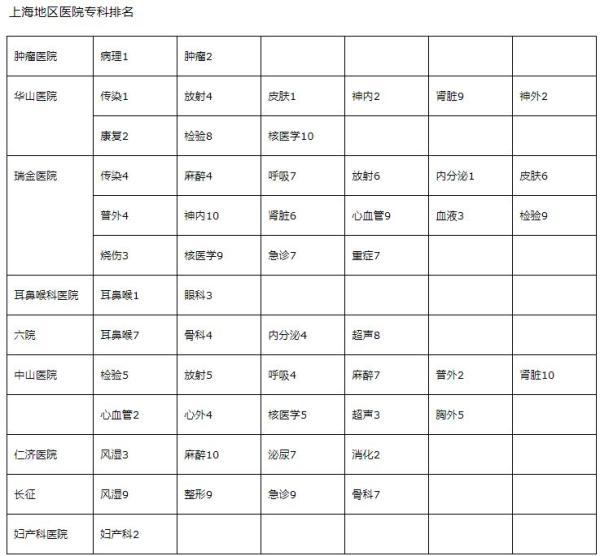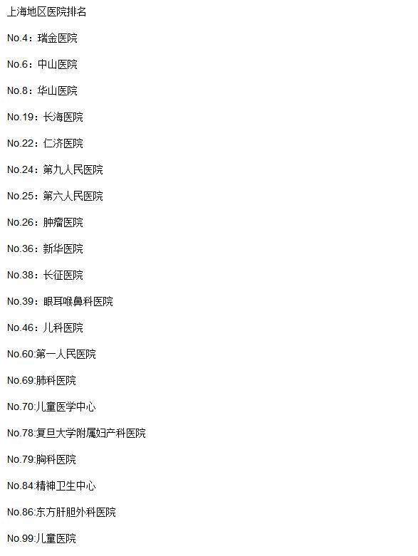 在全國醫(yī)院綜合排名百名名單中,上海3家醫(yī)院入圍前十,分別為上海交大醫(yī)學(xué)院附屬瑞金醫(yī)院、復(fù)旦大學(xué)附屬中山醫(yī)院、復(fù)旦大學(xué)附屬華山醫(yī)院。除此之外,長海醫(yī)院、仁濟醫(yī)院、上海市第九人民醫(yī)院、上海市第六人民醫(yī)院、復(fù)旦大學(xué)附屬腫瘤醫(yī)院、新華醫(yī)院、長征醫(yī)院、復(fù)旦大學(xué)附屬眼耳鼻喉科醫(yī)院、復(fù)旦大學(xué)附屬兒科醫(yī)院等總計20家醫(yī)院均入圍榜單。