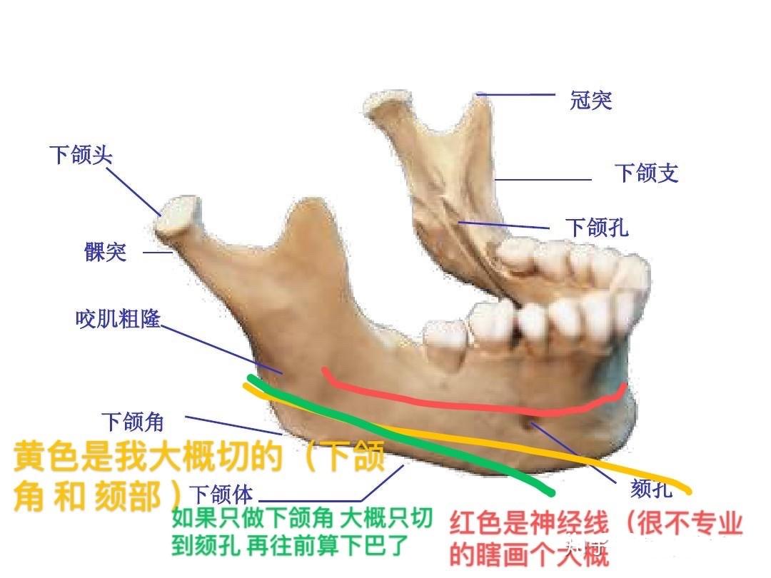 黃色就是我被切走的那部分了,像我下巴也寬,就是這樣切的,不然的話,醫(yī)生一般切綠線。