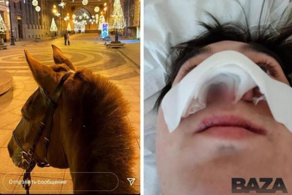 12月9日晚,在俄羅斯圣彼得堡市中心,一名醉酒男子試圖親吻一匹馬時(shí),鼻子被馬咬掉一塊。視頻顯示,25歲的瓦西里和朋友們?cè)诮诸^遇到了一名騎馬的女子,瓦西里搭訕被女騎手拒絕,隨后他試圖去親吻馬。女騎手警告他這很危險(xiǎn),建議他喂馬胡蘿卜。但瓦西里還是大膽湊上前親吻馬,結(jié)果被馬一口咬掉了鼻子??梢钥匆娡呶骼锪⒖涛嬷樁紫?,女騎手下馬試圖幫忙。