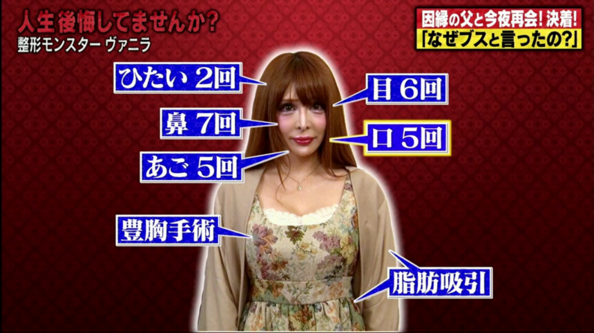 Vanilla除了臉外,牙齒、胸部通通都有整型,每個月還得花上2到300萬日幣維持,對此Vanilla表示整型是“找回自己”,就好像性別認(rèn)同障礙的人,他們認(rèn)為將自己的性別放入了錯誤的身體,而自己也是一樣,放入了錯誤的臉。所以要透過手術(shù),找回自己的臉。