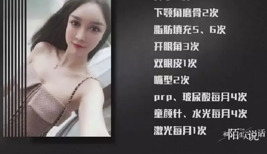吳曉辰的鼻子換過六次假體、面部脂肪填充手術(shù)也做過五、六次,開眼角四次,割雙眼皮一次,眼瞼下至手術(shù)、微笑唇等等。