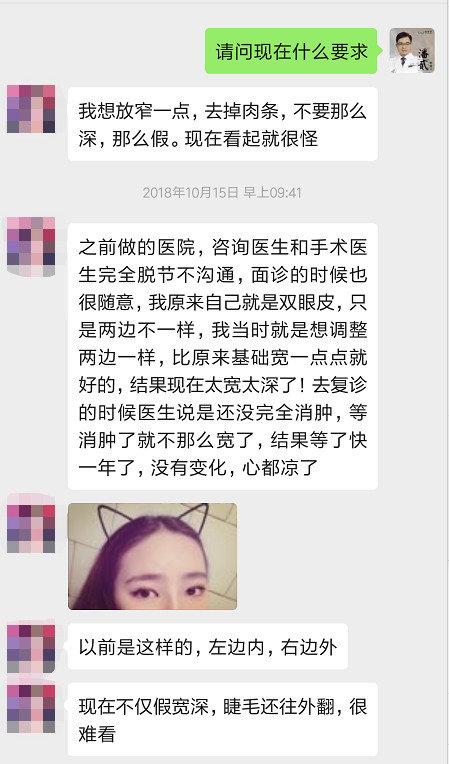 線上時說:“之前做的醫(yī)院,和手術(shù)醫(yī)生完全脫節(jié)不溝通,面診的時候也很隨意,我原來自己就是雙眼皮,只是兩邊不一樣,我當(dāng)時就是想調(diào)整兩邊一樣,比原來基礎(chǔ)寬一點點就好了,結(jié)果現(xiàn)在太寬太深了!去復(fù)診的時候醫(yī)生說是還沒完全消腫,等消腫了就不那么寬了,結(jié)果等了快一年了,沒有變化,心都涼了”