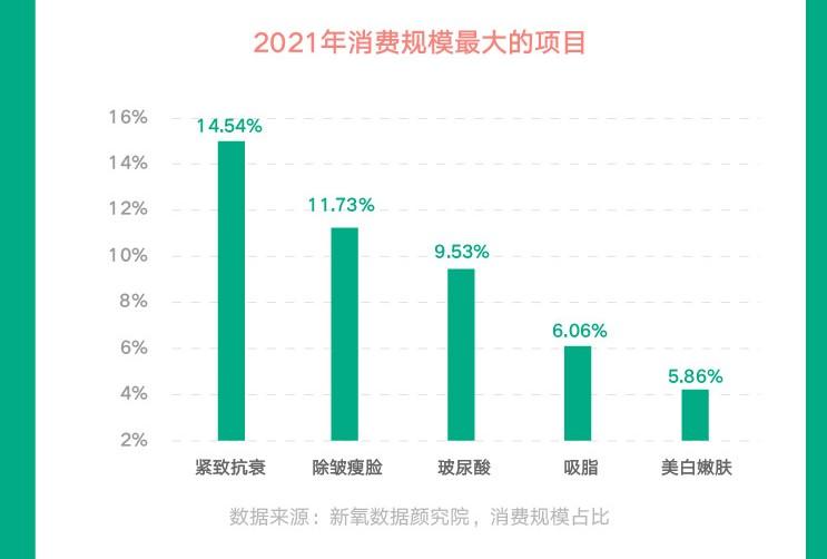 在具體消費(fèi)項(xiàng)目上,非手術(shù)項(xiàng)目受市場(chǎng)歡迎。2021年,消費(fèi)規(guī)模占比大的項(xiàng)目是緊致抗衰、除皺瘦臉、玻尿酸,在整體市場(chǎng)中占比14.55%、11.73%、9.53%。
