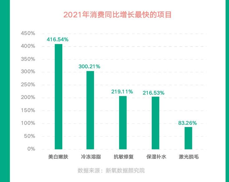 美白嫩膚、冷凍溶脂等項(xiàng)目,成為2021年消費(fèi)增速快的項(xiàng)目,同比增速分別高達(dá)416%、300%。身體塑形需求,也在逐漸走向精細(xì)化、非手術(shù)化,越來(lái)越多的人選擇冷凍溶脂等非手術(shù)項(xiàng)目減脂。