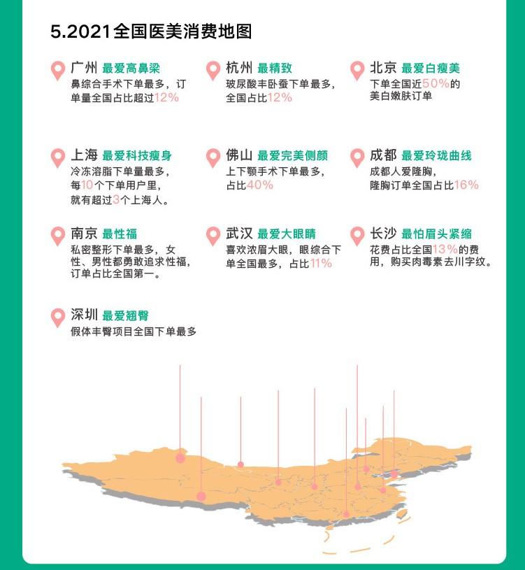 不同區(qū)域的醫(yī)美消費(fèi)也呈現(xiàn)出不同的特征。白皮書(shū)中“全國(guó)醫(yī)美消費(fèi)地圖”顯示,一線城市的消費(fèi)更為精細(xì)化、對(duì)非手術(shù)項(xiàng)目也更為關(guān)注,例如北京多美白嫩膚訂單、上海下單多冷凍溶脂項(xiàng)目。而新一線、二線城市則呈現(xiàn)出不同的地域特征,例如南京私密整形訂單多,長(zhǎng)沙人下單了多的肉毒毒素去川字紋等。