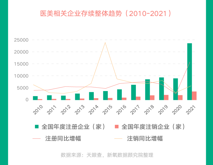 而對(duì)于醫(yī)美機(jī)構(gòu)來(lái)說(shuō),面對(duì)如今競(jìng)爭(zhēng)更加激烈的醫(yī)美市場(chǎng),通過(guò)投放和營(yíng)銷(xiāo)獲取新客源的方式已是捉膝見(jiàn)肘,精細(xì)化運(yùn)營(yíng)迫在眉睫。據(jù)天眼查數(shù)據(jù),截至2021年11月8日,企業(yè)名稱(chēng)或經(jīng)營(yíng)范圍含“醫(yī)美、醫(yī)療美容、整形”類(lèi)企業(yè)2021年注銷(xiāo)數(shù)量同比增加64.32%。