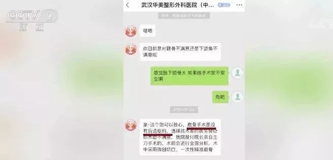 記者在某APP平臺武漢華美外科整形醫(yī)院的官方號咨詢下頜角截骨手術(shù),客服人員告訴記者,手術(shù)不會產(chǎn)生任何后遺癥,記者又先后走訪了武漢和北京的幾家整形醫(yī)院。