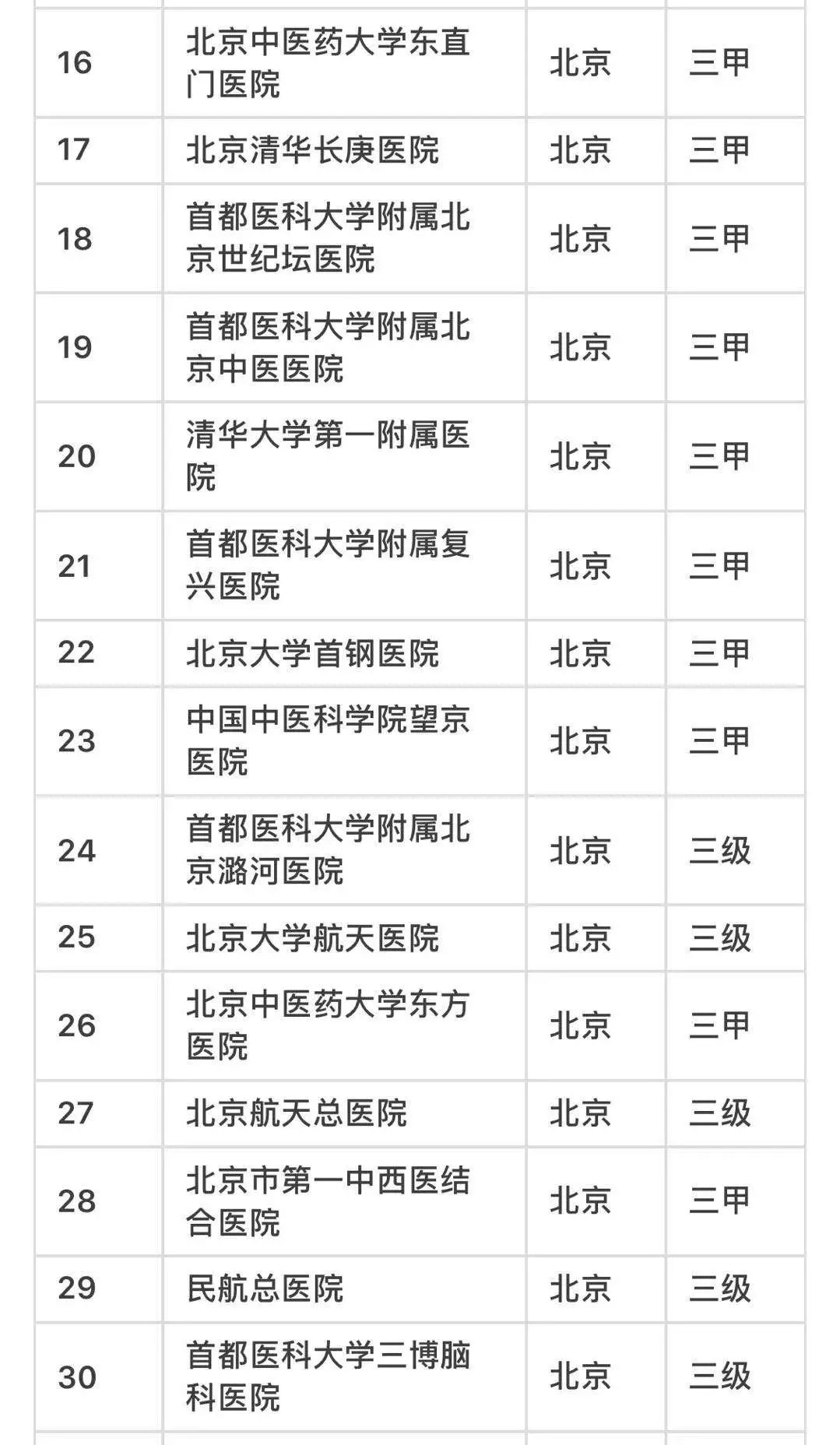 名次醫(yī)院城市級(jí)別1北京協(xié)和醫(yī)院北京三甲2北京大學(xué)第一醫(yī)院北京三甲3北京大學(xué)人民醫(yī)院北京三甲4北京大學(xué)第三醫(yī)院北京三甲5首都醫(yī)科大學(xué)附屬北京安貞醫(yī)院北京三甲6首都醫(yī)科大學(xué)附屬北京天壇醫(yī)院北京三甲7北京朝陽(yáng)醫(yī)院北京三甲8首都醫(yī)科大學(xué)宣武醫(yī)院北京三甲9首都醫(yī)科大學(xué)附屬北京同仁醫(yī)院北京三甲10中日友好醫(yī)院北京三甲11北京醫(yī)院北京三甲12首都醫(yī)科大學(xué)附屬北京友誼醫(yī)院北京三甲13北京積水潭醫(yī)院北京三甲14中國(guó)中醫(yī)科學(xué)院西苑醫(yī)院北京三甲15中國(guó)中醫(yī)科學(xué)院廣安門(mén)醫(yī)院北京三甲16北京中醫(yī)藥大學(xué)東直門(mén)醫(yī)院北京三甲17北京清華長(zhǎng)庚醫(yī)院北京三甲18首都醫(yī)科大學(xué)附屬北京世紀(jì)壇醫(yī)院北京三甲19首都醫(yī)科大學(xué)附屬北京中醫(yī)醫(yī)院北京三甲20清華大學(xué)第一附屬醫(yī)院北京三甲21首都醫(yī)科大學(xué)附屬?gòu)?fù)興醫(yī)院北京三甲22北京大學(xué)首鋼醫(yī)院北京三甲23中國(guó)中醫(yī)科學(xué)院望京醫(yī)院北京三甲24首都醫(yī)科大學(xué)附屬北京潞河醫(yī)院北京三級(jí)25北京大學(xué)航天醫(yī)院北京三級(jí)26北京中醫(yī)藥大學(xué)東方醫(yī)院北京三甲27北京航天總醫(yī)院北京三級(jí)28北京市第一中西醫(yī)結(jié)合醫(yī)院北京三甲29民航總醫(yī)院北京三級(jí)30首都醫(yī)科大學(xué)三博腦科醫(yī)院北京三級(jí)